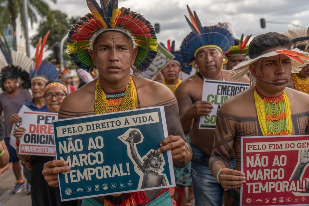 O maior conflito jurídico recente envolvendo direitos indígenas foi a tentativa de impor a tese do Marco Temporal, segundo a qual apenas teriam direito à terra os povos que estivessem fisicamente em seus territórios em 5 de outubro de 1988.